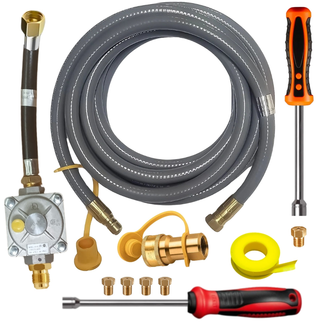 This Product Comes with Complete Detailed Instructions, Orifice Removal Tools, Natural Gas Hose and Quick Disconnect Fitting, NG Pressure Regulator with Fittings Pre-Installed For Easy Connection, and Teflon Tape
