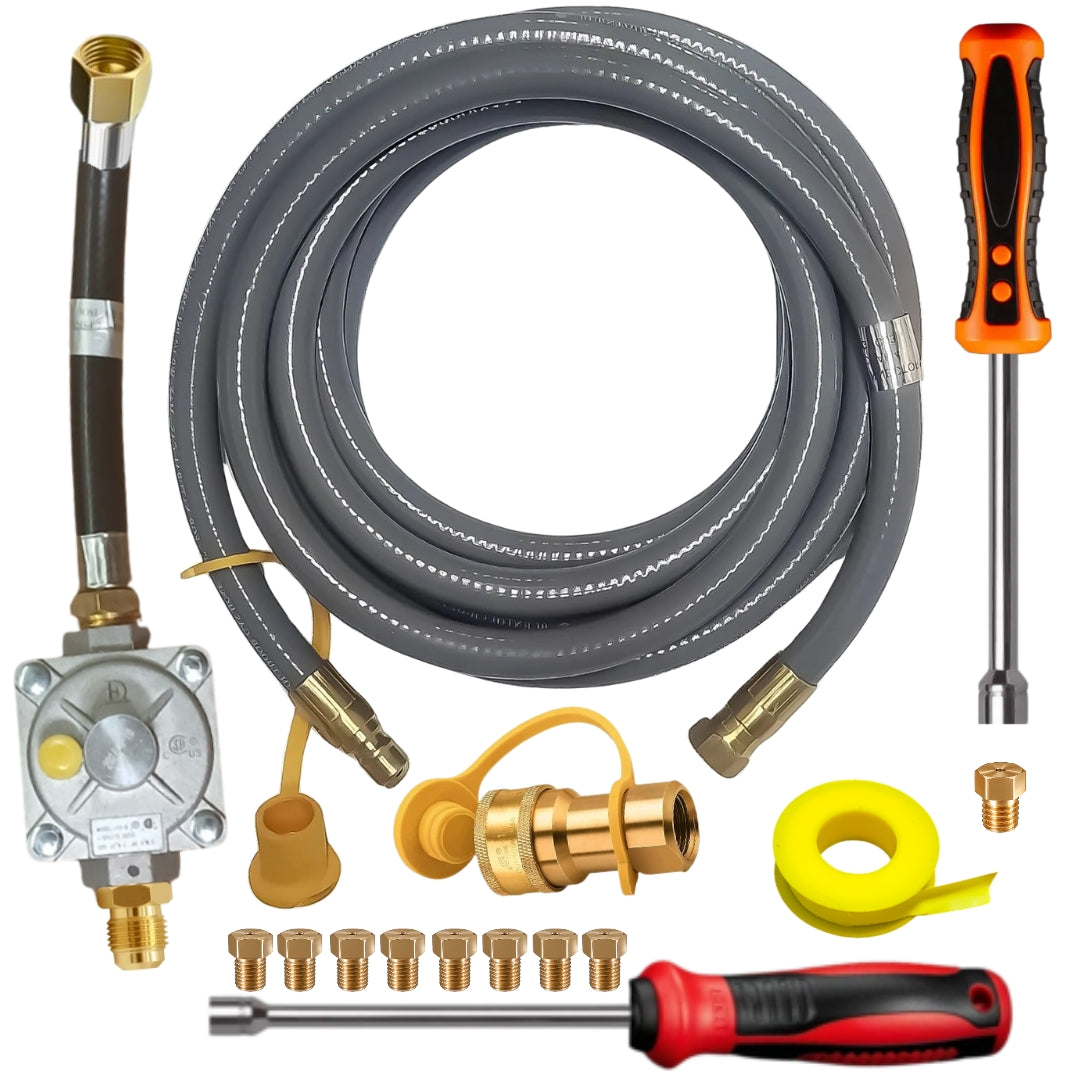 This Product Comes with Complete Detailed Instructions, Orifice Removal Tools, Natural Gas Hose and Quick Disconnect Fitting, NG Pressure Regulator with Fittings Pre-Installed For Easy Connection, and Teflon Tape